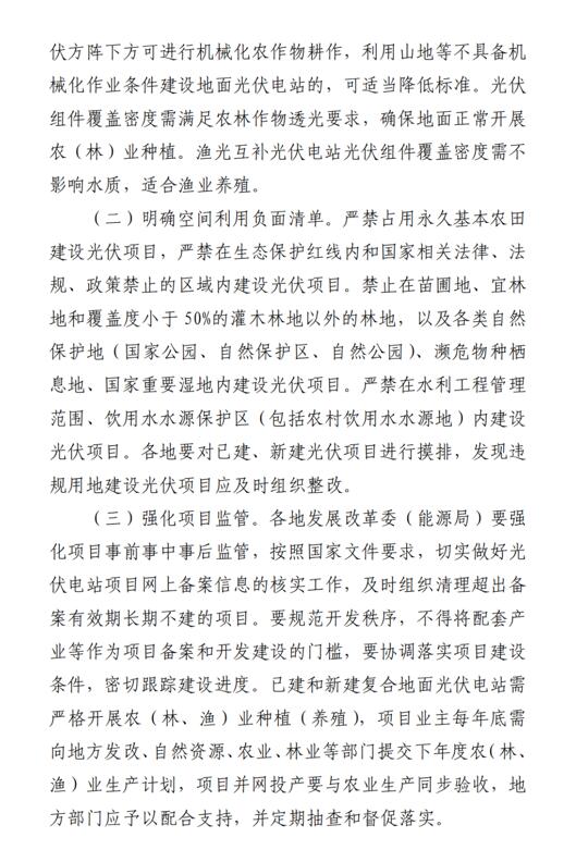 用地方面,允許在設施農業上建設農光互補、菌光互補項目,利用農用地布設的光伏方陣可不改變原用地性質。光伏復合項目應堅持“以農為先”,新建復合地面光伏電站光伏組件安裝高度最低處不低于2米,方陣前后陣列中心間距原則上不少于7米。嚴禁占用永久基本農田、在生態保護紅線內以及各類自然保護地建設光伏項目。此外,已建和新建復合地面光伏電站需嚴格開展農(林、漁)業種植(養殖),項目業主每年底需向地方發改委、自然資源、農業、林業等部門提交下年度農(林、漁)業生產計劃,項目并網投產要與農業生產同步驗收。
