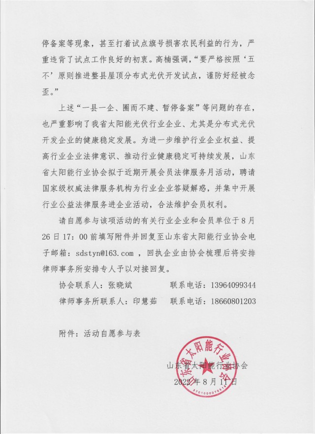 請自愿參與該項活動的有關行業企業和會員單位于8月26日17:00 前填寫附件并回復至山東省太陽能行業協會電子郵箱:sdstyn@163.com,回執企業由協會梳理后將安排律師事務所安排專人予以對接回復。