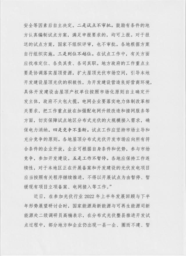啟動整縣(市、區)推進屋頂分布式光伏開發試點工作,主要目的就是充分調動和發揮地方積極性,引導地方政府協調更多屋頂資源,進一步開拓市場,擴大屋頂分布式光伏的建設規模。去年,國家能源局提出“在開展整縣(市、區)推進屋頂分布式光伏開發試點工作中需要著重把握以下五個方面:一是自愿不強制。各地是否開展試點以及開展多少個試點由各地根據自身實際情況自己決定,不搞行政命令。建筑屋頂是否開展建設,由屋頂產權單位綜合考慮屋頂承重、安全等因素后自主決定。二是試點不審批。鼓勵有條件的地方認真編制試點方案,滿足申報要求的,均可上報。對于報送的試點方案,國家不組織評審,也不審批。各地根據方案自行組織實施。三是到位不越位。在試點工作中,有關方面應找準定位、各負其責、各司其職。地方政府的工作重點主要是協調落實屋頂資源,擴大屋頂光伏市場空間,引導本地開發建設屋頂光伏的積極性,為開發建設營造良好營商環境,具體開發建設由屋頂產權單位按照市場化原則自主確定開發主體,政府不大包大攬。電網企業要落實電力體制改革相關要求,把工作重點放在加強配電網升級改造和接網服務等方面,切實保障試點地區分布式光伏的大規模接入需求,確保電力消納。四是競爭不壟斷。試點工作應堅持市場主導和充分競爭的原則。各地屋頂分布式光伏開發市場應向所有符合條件的企業開放,企業可根據自身條件和優勢,參與市場競爭,參加開發建設。五是工作不暫停。各地應保持工作連續性,對于本地區正在開展備案和開發建設的光伏發電項目應當按照有關程序繼續推進,不得以開展試點為由暫停、暫緩現有項目立項備案、電網接入等工作。”