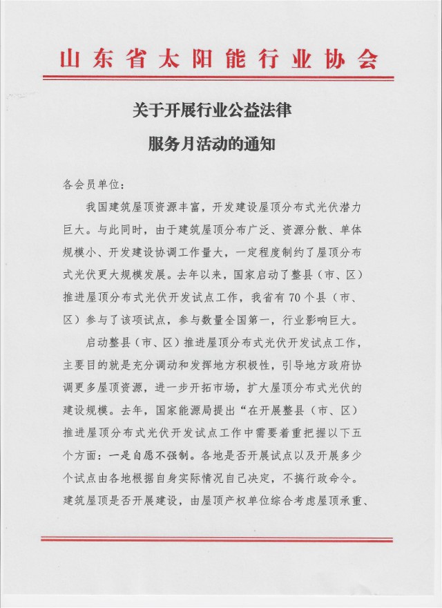 上述“一縣一企、圈而不建、暫停備案”等問題的存在,也嚴重影響了我省太陽能光伏行業企業、尤其是分布式光伏開發企業的健康穩定發展。為進一步維護行業企業權益、提高行業企業法律意識、推動行業健康穩定可持續發展,山東省太陽能行業協會擬于近期開展會員法律服務月活動,聘請國家級權威法律服務機構為行業企業答疑解惑,并集中開展行業公益法律服務進企業活動,合法維護會員權利。