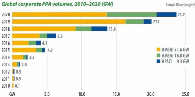 根據BNEF的數據,2020年公司性PPA(主要是太陽能和風能)的容量飆升至創紀錄的23.7GW。而這種上升趨勢將一直延續。