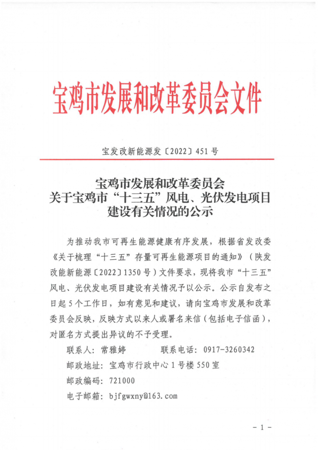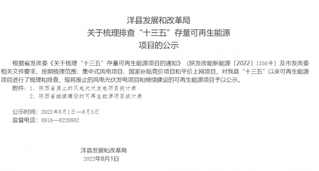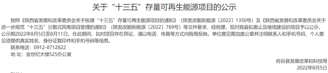 根據(jù)省發(fā)展改革委《關(guān)于梳理“十三五”存量可再生能源項(xiàng)目的通知》(陜發(fā)改能新能源〔2022〕1350號(hào))文件要求,現(xiàn)將我市擬上報(bào)省發(fā)改委“十三五”風(fēng)電、光伏發(fā)電項(xiàng)目建設(shè)有關(guān)情況予以公示。公示自發(fā)布之日起5個(gè)工作日,如有意見和建議,請(qǐng)向渭南市發(fā)展和改革委員會(huì)反映,反映方式以來人或署名來信(包括電子信函),對(duì)匿名方式提出異議的不予受理。
