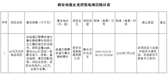 按照省發(fā)展改革委《關(guān)于梳理“十三五”存量可再生能源項(xiàng)目的通知》(陜發(fā)改能新能源〔2022〕1350)有關(guān)要求,我委對(duì)全市2019-2020年國家補(bǔ)貼競價(jià)項(xiàng)目、省級(jí)平價(jià)上網(wǎng)項(xiàng)目進(jìn)行了梳理匯總,西安中旭新能源有限公司40兆瓦光伏電站項(xiàng)目于2020年5月通過備案,截至目前,該項(xiàng)目仍未開工建設(shè)。經(jīng)我委與項(xiàng)目所在地臨潼區(qū)確認(rèn),情況屬實(shí),經(jīng)研究,認(rèn)為該項(xiàng)目為本次梳理可再生能源廢止項(xiàng)目。現(xiàn)將項(xiàng)目情況通過西安市發(fā)改委官方網(wǎng)站(xadrc.xa.gov.cn)進(jìn)行公示(詳見附表),公示時(shí)間自2022年8月12日起至18日止,請(qǐng)社會(huì)各界予以監(jiān)督。