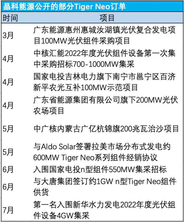 產能不斷攀升的同時,晶科能源主推的n型Tiger Neo系列組件在市場上斬獲大量訂單,大大加速了TOPCon產業化進程。晶科能源公開的部分Tiger Neo訂單包括: