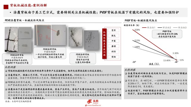 涂覆背板由于其工藝方式,需要特別關注其機械性能;PVDF背板在低溫下有脆化的風險,也需要加強防護。