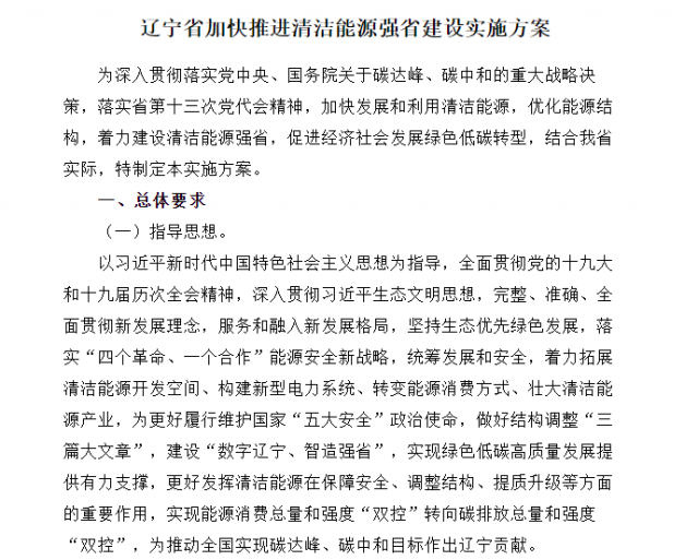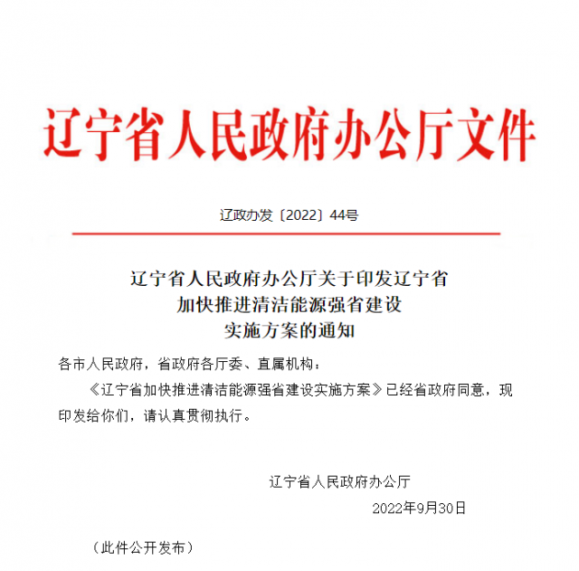 近日,遼寧省人民政府發布《遼寧省加快推進清潔能源強省建設實施方案》。
