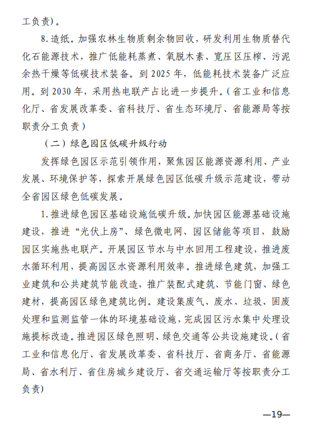 發揮綠色園區示范引領作用,聚焦園區能源資源利用、產業 發展、環境保護等,探索開展綠色園區低碳升級示范建設,帶動 全省園區綠色低碳發展。 推進綠色園區基礎設施低碳升級。加快園區能源基礎設施建設,推進“光伏上房”、綠色微電網、園區儲能等項目,鼓勵園區實施熱電聯產。