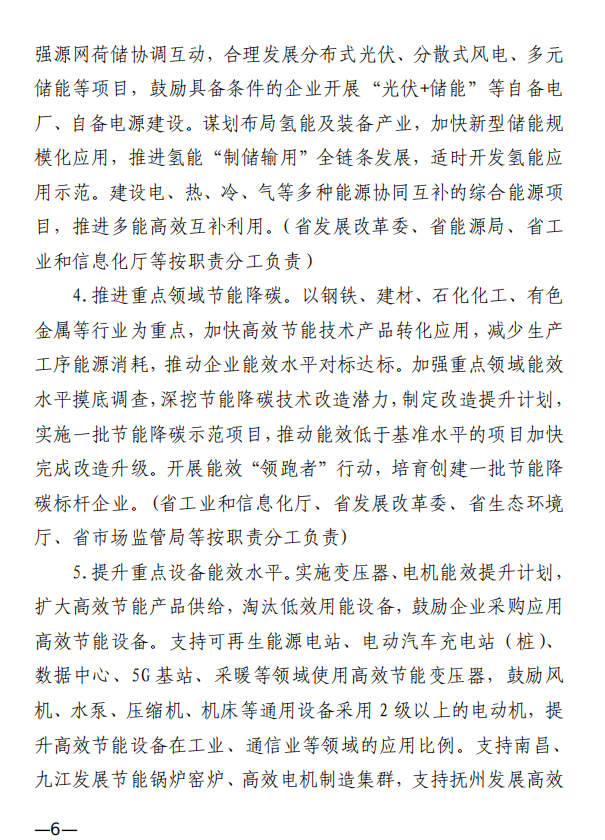 方案提出,逐步擴大可再生能源供給。加快工業綠色微電網建設,增強源網荷儲協調互動,合理發展分布式光伏、分散式風電、多元 儲能等項目,鼓勵具備條件的企業開展“光伏+儲能”等自備電廠、自備電源建設。謀劃布局氫能及裝備產業,加快新型儲能規模化應用,推進氫能“制儲輸用”全鏈條發展,適時開發氫能應用示范。建設電、熱、冷、氣等多種能源協同互補的綜合能源項目,推進多能高效互補利用。