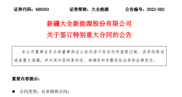 10月25日,大全能源公告,新疆大全新能源股份有限公司及全資子公司 內(nèi)蒙古大全新能源有限公司近日與某客戶簽訂了 《采購框架合同》。