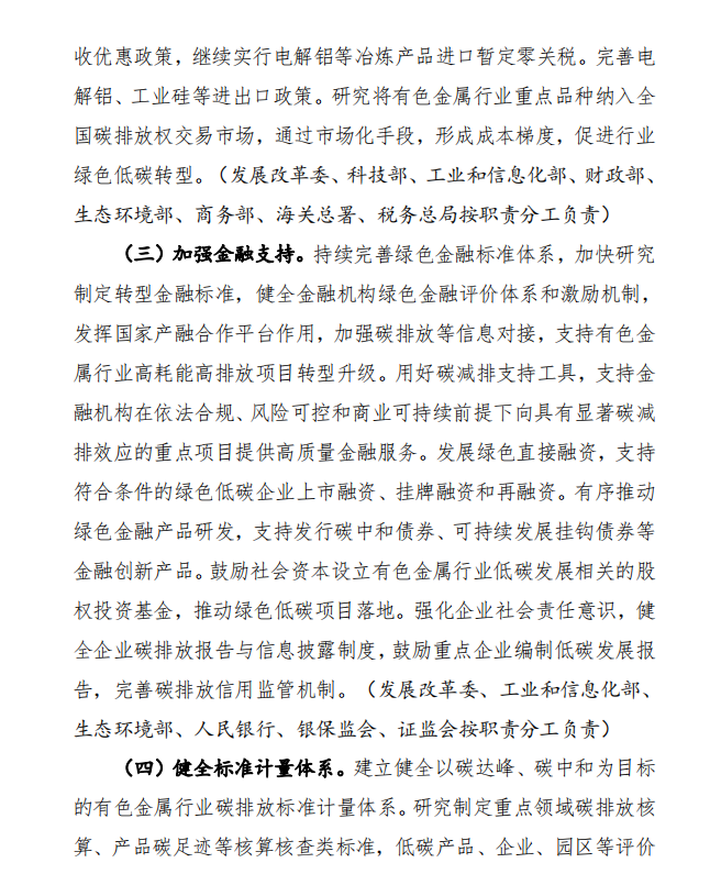 11月15日,工業(yè)和信息化部、國家發(fā)展和改革委員會和生態(tài)環(huán)境部發(fā)布《關(guān)于印發(fā)有色金屬行業(yè)碳達(dá)峰實施方案的通知》,(以下簡稱通知)通知指出,控制化石能源消費。推進(jìn)有色金屬行業(yè)燃煤窯爐以電代煤,提升用能電氣化水平。在氣源有保障、氣價可承受的條件下有序推進(jìn)以氣代煤。推動落后自備燃煤機組淘汰關(guān)?;虿捎们鍧嵢剂咸娲?。嚴(yán)禁在國家政策允許的領(lǐng)域以外新(擴)建燃煤自備電廠,推動電解鋁行業(yè)從使用自備電向網(wǎng)電轉(zhuǎn)化。支持企業(yè)參與光伏、風(fēng)電等可再生能源和氫能、儲能系統(tǒng)開發(fā)建設(shè)。加強企業(yè)節(jié)能管理,嚴(yán)格落實國家強制性節(jié)能標(biāo)準(zhǔn),持續(xù)開展工業(yè)節(jié)能監(jiān)察,規(guī)范企業(yè)用能行為。