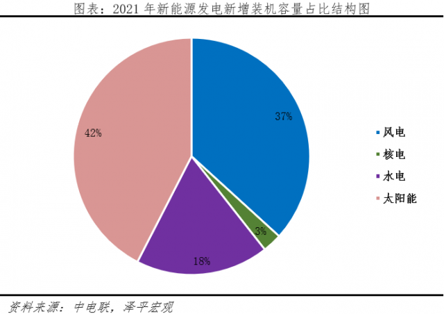 光伏是新能源發電端建設的核心領域之一,中電聯數據顯示,2021年我國太陽能新增裝機容量為54930兆瓦,同比增長14.0%,占新能源發電新增裝機總容量的42%。