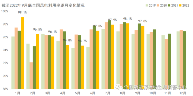 截至9月底全國風電利用率逐月變化情況