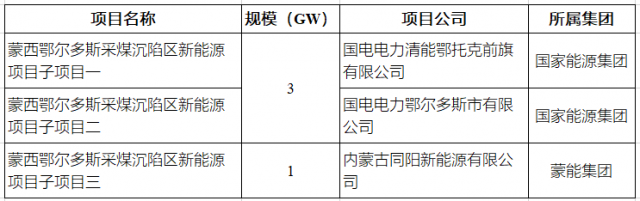 蒙西鄂爾多斯采煤沉陷區新能源項目共分三個子項目。其中,國家能源集團獲得兩個子項目,總規模為3GW,蒙能集團獲得一個子項目,規模為1GW。