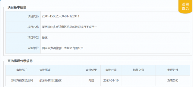 1月16日,國家能源集團國電電力蒙西鄂爾多斯采煤沉陷區300萬千瓦光伏項目取得備案證明。