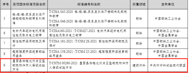 依據工信部函【2022】272號--工業和信息化部關于公布2022年團體標準應用示范項目的通告,中關村材料試驗技術聯盟(CSTM)發布的標準《屋面晶體硅光伏與壓型鋼板構件防火等級試驗方法》(T/CSTM 00260-2021)入圍2022年團體標準應用示范項目。