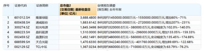 上游利潤全年稱王,但Q4增速明顯分化7家千億光伏股,隆基綠能(601012.SH)、通威股份(600438.SH)、陽光電源(300274.SZ)、晶澳科技(002459.SZ)、晶科能源(688223.SH)、天合光能(688599.SH)、TCL中環(002129.SZ)2022年業績均為預增。