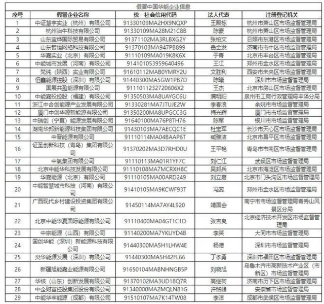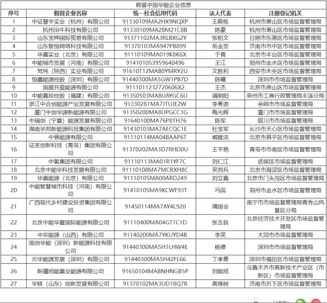 3月22日,華能新能源股份有限公司發布嚴正聲明,稱有不法分子通過偽造華能新能源股份有限公司證照和印章,在全國多地將17家企業登記為華能新能源下屬子公司,并可能存在涉嫌以華能新能源及所屬企業名義開展經營活動的情形,其中部分企業侵犯了“華能”字號,對華能新能源的聲譽造成不良影響。