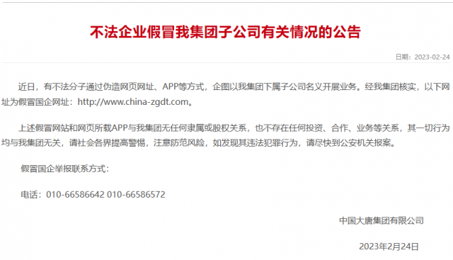2月24日,大唐集團公告稱,有不法分子通過偽造網頁網址、APP等方式,企圖以大唐集團下屬子公司名義開展業務。以下為公告原文: