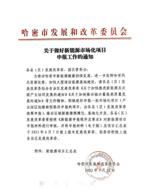 近日,新疆哈密市發布《關于做好新能源市場化項目申報工作的通知》。
