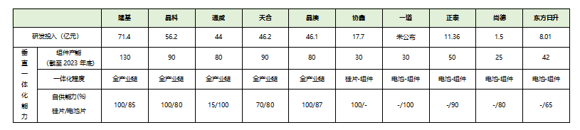 長期高強度的研發投入是科研實力長期引領的良性循環指標。據上半年中標規模TOP10企業2022年年報數據所示,企業年研發投入占營收的比例均約為5.44%,而排名TOP5的企業已與第二梯隊形成代際差。由于龍頭企業具備成本優勢、資源優勢和整合優勢,相較于行業內其它企業更具競爭力。對于技術研發和擴產的強勢布局,是龍頭企業戰略性的判斷和對技術領先的自信,亦是龍頭企業未來應對產業爆發的交付儲備,垂直一體化自供能力達到80%的企業則具有更好的交付保障能力。