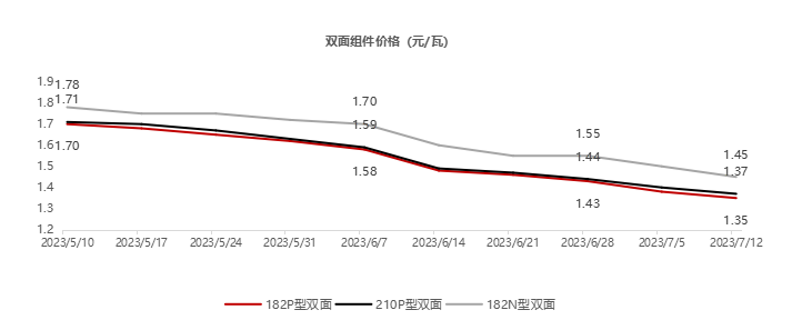2023年上半年,光伏產業鏈各主材環節價格均呈大幅下跌趨勢,從上游向下游(硅料-硅片-組件)的降幅依次均有遞減。據PV InfoLink數據顯示,以182雙面PERC組件價格為例,從5月初的1.7元/瓦跌至近期的1.35元/瓦。