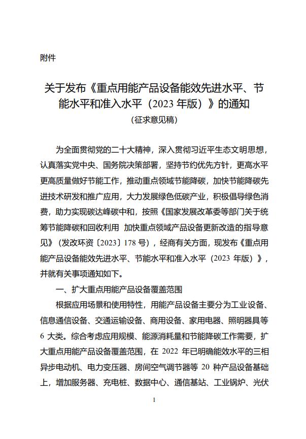 附件:關于發布《重點用能產品設備能效先進水平、節能水平和準入水平(2023年版)》的通知(征求意見稿)