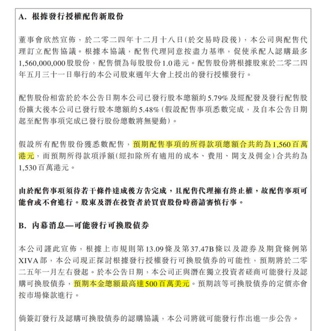 12月19日早間,協鑫科技通過港交所發布公告,公司完成15.6億股閃電配售,配售價每股1港元。同時,公司將發行可轉債5億美元。
