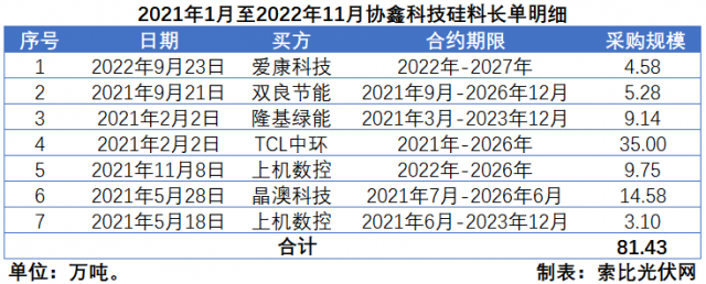 協(xié)鑫科技簽署7筆長(zhǎng)單,規(guī)模合計(jì)81.43萬(wàn)噸。