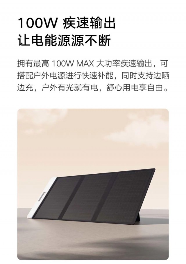米家太陽能板100W擁有最高100W MAX大功率,可搭配戶外電源進(jìn)行快速補(bǔ)能,同時支持邊曬邊充,戶外有光就有電。