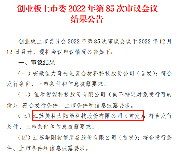 12月12日,深圳證券交易所創(chuàng)業(yè)板上市委員會(huì)發(fā)布公告稱,江蘇美科太陽能科技股份有限公司的首次公開發(fā)行股票申請(qǐng)符合發(fā)行條件、上市條件和信息披露要求。