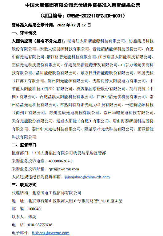 12月12日,中國(guó)大唐集團(tuán)對(duì)光伏組件資格準(zhǔn)入審查結(jié)果進(jìn)行公示,共31家光伏組件企業(yè)入圍。