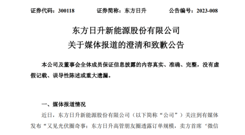 雖然朋友圈留存的時間不長,但其內容還是被有關媒體捕捉到并迅速曝光。就此,東方日升于1月12日就相關媒體報道發布澄清和致歉公告,將涉及的有關言論的具體情況、公司儲能業務訂單情況及電池組件非硅成本情況進行了說明。公告稱“莊英宏發布的相關言論均系其個人行為,不代表公司立場。”“莊英宏所述‘23年在手已簽4吉瓦時多了’為其與公司儲能業務相關同事交流了解后作出的個人理解,口徑為公司雙簽訂單量與意向在談訂單量的合并量。”