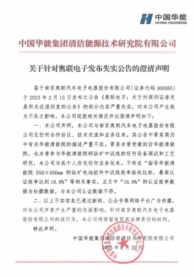 奧聯電子鈣鈦礦效率疑似作假 華能發布澄清公告