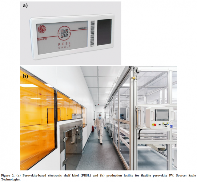 市場(chǎng)規(guī)模和增長(zhǎng)當(dāng)然不是唯一需要考慮的重要方面。從制造商的角度來看,開發(fā)定制量最少的產(chǎn)品很重要,因?yàn)檫@會(huì)帶來額外的風(fēng)險(xiǎn)和成本。此外,如何將額外的功率預(yù)算貨幣化是非常重要的。考慮到所有這些,電子貨架標(biāo)簽似乎是最有吸引力的選擇之一。Saule 開發(fā)的基于鈣鈦礦的電子貨架標(biāo)簽 (PESL) 的示例和用于制造柔性鈣鈦礦 PV 的試點(diǎn)生產(chǎn)設(shè)施如圖 2 所示。