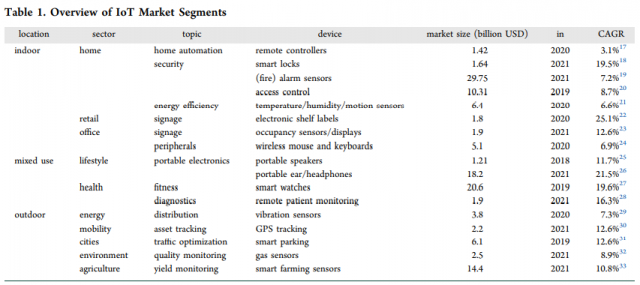 雖然物聯(lián)網(wǎng)市場(chǎng)巨大且增長(zhǎng)迅速,但要確定能量收集的最佳應(yīng)用并非易事。用例將定義需要由太陽(yáng)能模塊提供的功率預(yù)算。放置設(shè)備的環(huán)境和產(chǎn)品的外形尺寸定義了可能收集的能量的邊界條件。最重要的是,從業(yè)務(wù)角度來看,整合應(yīng)該是有意義的,因此需要進(jìn)行仔細(xì)的成本/收益分析,同時(shí)考慮到環(huán)境影響。為了解決這些問題,Saule的方法是查看物聯(lián)網(wǎng)應(yīng)用程序中最大和增長(zhǎng)最快的部分,并按位置、部門、設(shè)備類型和價(jià)值主張對(duì)其進(jìn)行分類。表 1 總結(jié)了一些已識(shí)別的機(jī)會(huì)。