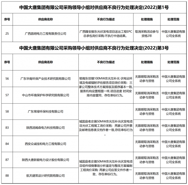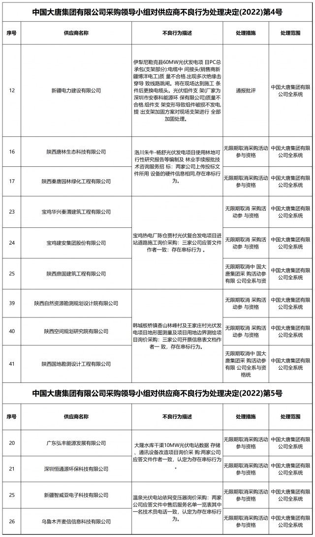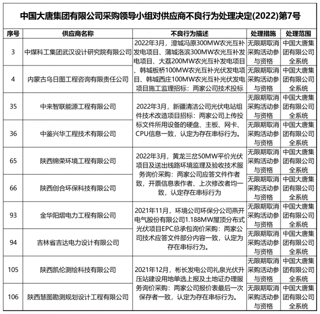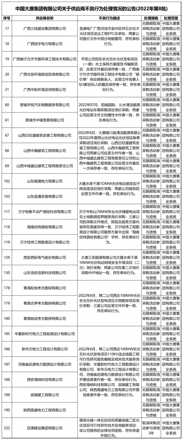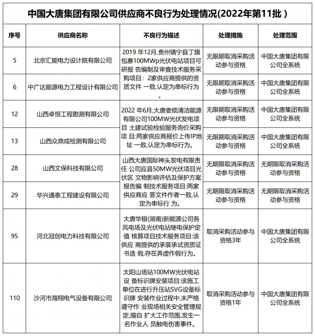 12月13日,中國大唐集團有限公司關于供應商不良行為處理情況的公告 (2022年第12批)公示,對出現不誠信行為、履約不力以及產品質量等問題的供應商進行了處理。本批次大唐集團共公布受處罰企業137家,其中,光伏相關企業共6家。