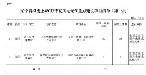 公告稱,遼寧省480萬千瓦風電光伏重點建設項目中存在“核而不建”“建設滯后”等問題的風電光伏項目進行了梳理。相關地市上報了擬廢止項目清單,經我委匯總,擬廢止未按期建成并網的遼能南票200MW光伏發電項目、南票暖池塘50MW光伏發電項目等2個光伏發電項目共計25萬千瓦未并網規模指標。