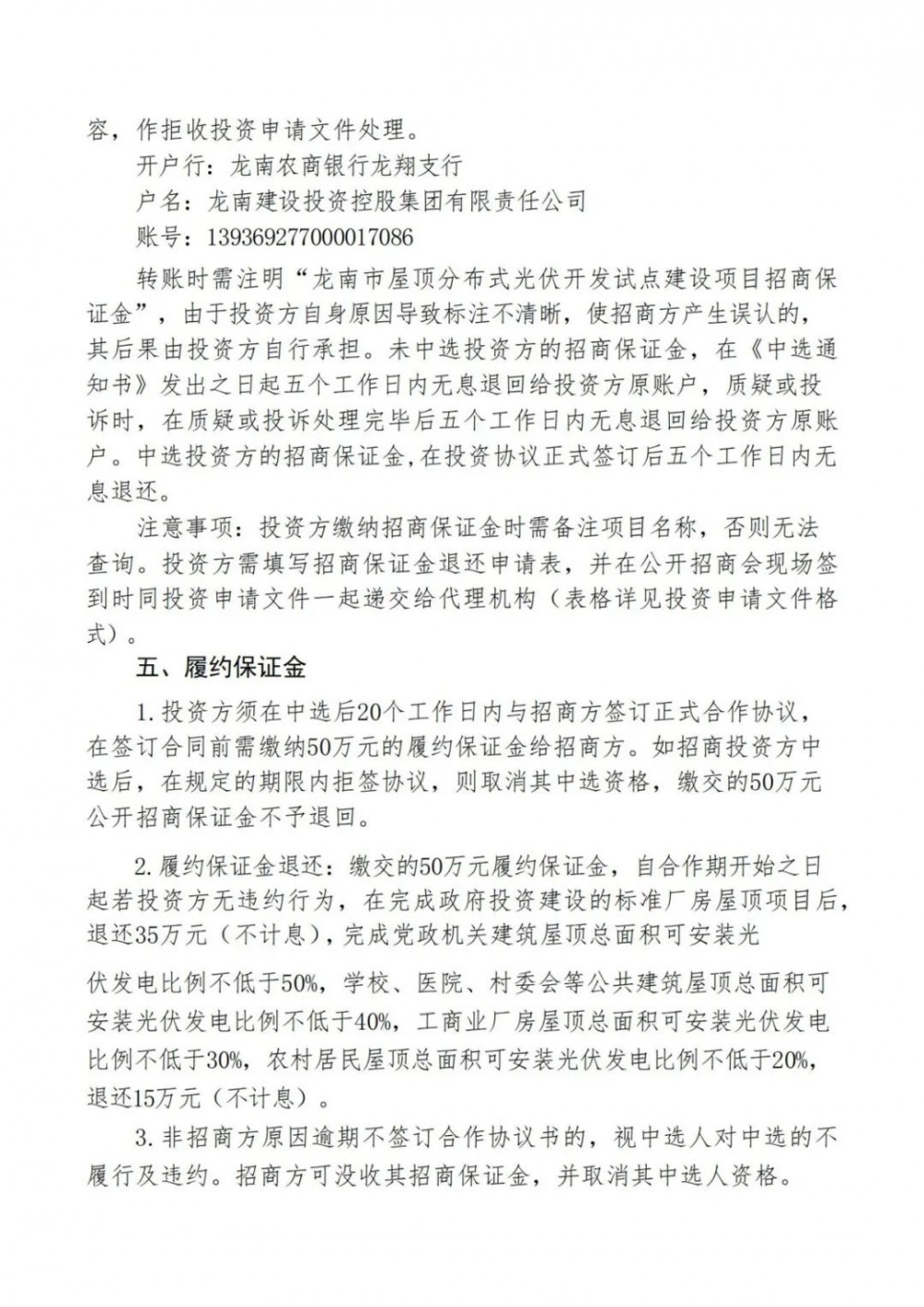 根據(jù)公告,本次招商項目總投資約20億元,首期投資約3億元。建設(shè)內(nèi)容為龍南市內(nèi)黨政機關(guān)、學校、醫(yī)院、村委會、工業(yè)園區(qū)廠房和農(nóng)村房屋屋頂光伏開發(fā)。通過招商方式引進投資方負責項目建設(shè)及運營。龍南建設(shè)投資控股集團有限責任公司將可以建設(shè)光伏電站的所有屋頂以租賃方式租賃給投資方建設(shè)分布式光伏電站,若招商方需要則共同投資,另行約定。投資方負責項目全部投資,包含但不限于建設(shè)期間的設(shè)計、設(shè)備采購、安裝、調(diào)試、驗收等費用以及運營期間的管理、維護等費用。