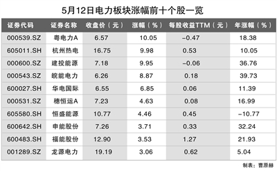 同花順數據顯示,5月12日截至收盤,電力板塊指數漲1.03%,粵電力A、杭州熱電、建投能源3只個股均漲停,另有皖能電力、華電國際2只個股均漲超5%,分別為8.87%、6.85%。