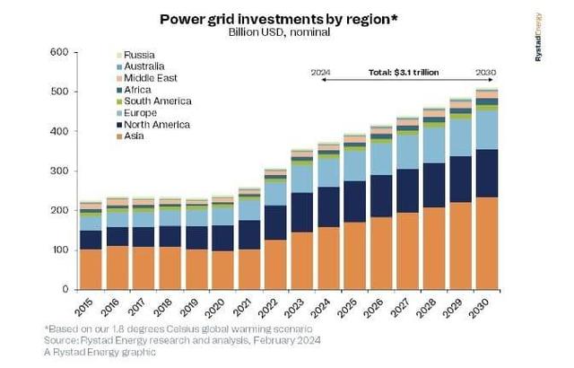 可再生能源的發展仍在以驚人的速度進行,2024年將有6440億美元用于新增產能,但過時和不足的電網可能會成為能源轉型的重大障礙。根據Rystad Energy的研究,如果世界要將全球變暖限制在比工業化前水平高1.8攝氏度的范圍內,那么在2030年之前需要3.1萬億美元的電網基礎設施投資。