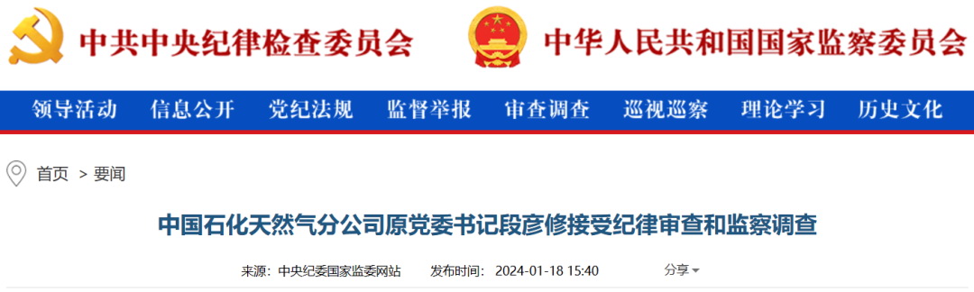 中央紀委國家監委網站1月18日消息,據中國石化紀檢監察組、山東省紀委監委消息:中國石化天然氣分公司原黨委書記段彥修涉嫌嚴重違紀違法,目前正接受中國石化紀檢監察組和山東省濱州市監委紀律審查和監察調查。
