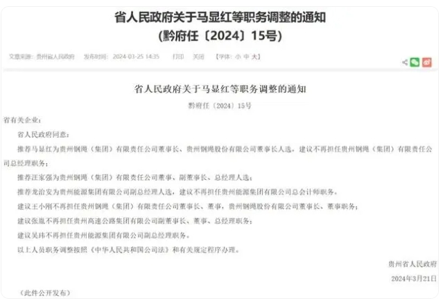 據貴州省人民政府網3月25日消息,貴州省人民政府發布關于馬顯紅等職務調整的通知。其中,推薦龍治安為貴州能源集團有限公司副總經理人選,建議不再擔任貴州能源集團有限公司總會計師職務。建議吳瑋不再擔任貴州能源集團有限公司副總經理職務。