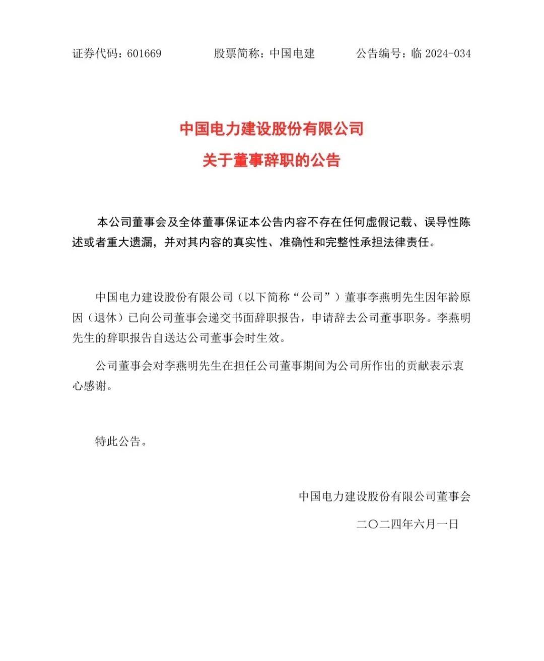 6月1日,中國電建發布公告稱,公司董事李燕明先生因年齡原因(退休)已向公司董事會遞交書面辭職報告,申請辭去公司董事職務。李燕明先生的辭職報告自送達公司董事會時生效。