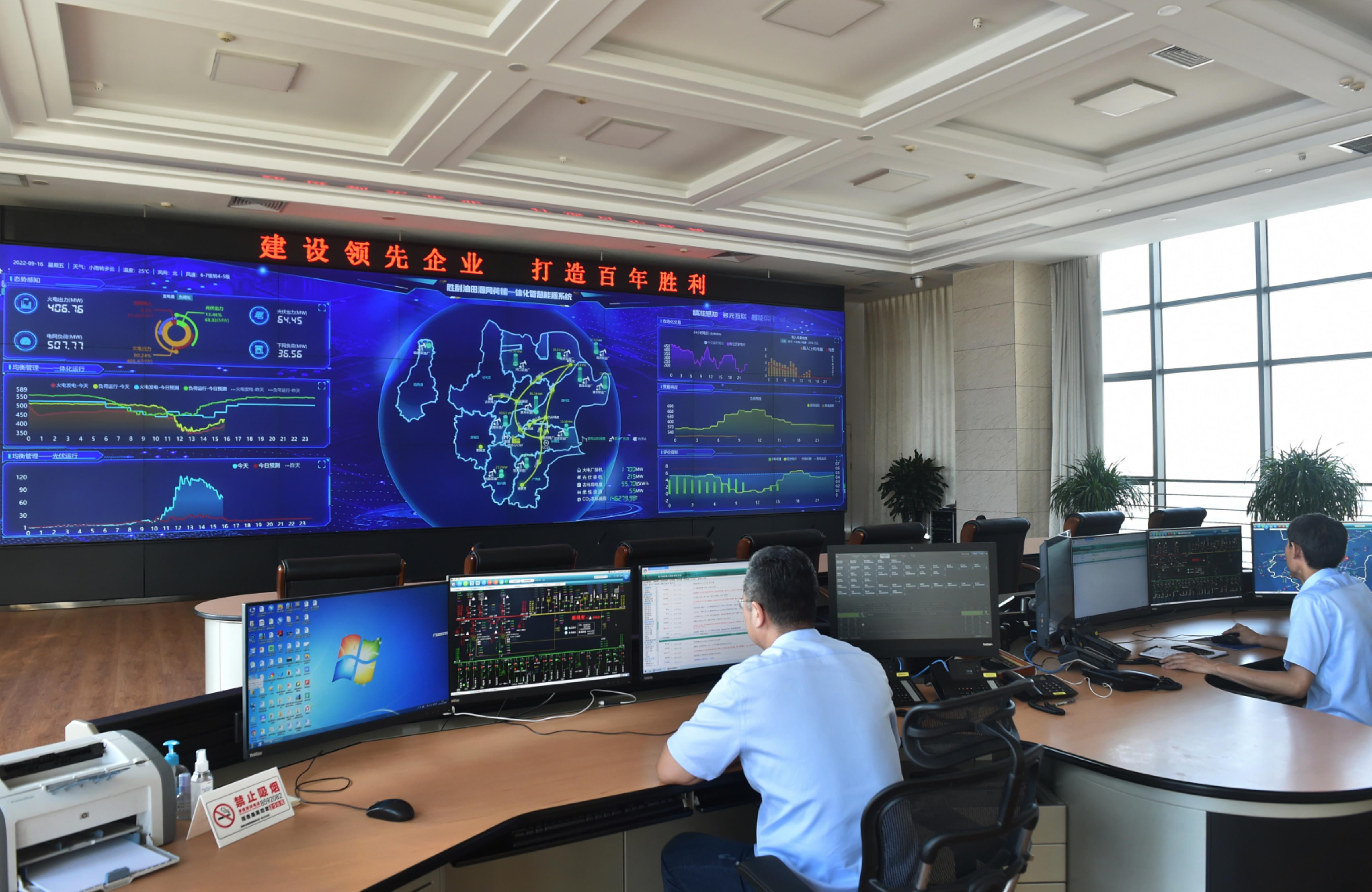 東營市淄博路105號,中國石化勝利油田電力調度中心的大屏幕上,數字實時跳動,“智慧大腦”高速運轉,一張網全面感知每時每刻電力供需,智慧調節源、網、荷、儲各個環節的資源配置;