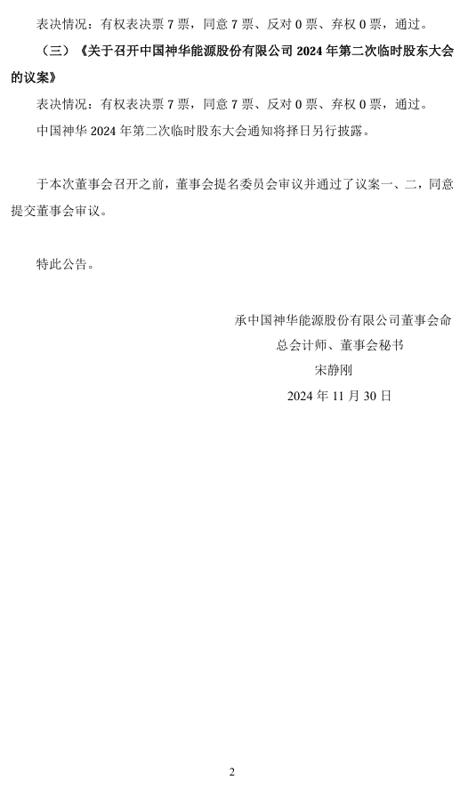中國神華11月30日發布公告,公司第六屆董事會第四次會議于2024年11月26日以電子郵件及無紙化辦公系統方式向全體董事和監事發送了會議通知、議案等會議材料,并于2024年11月29日以書面審議方式召開。公司全體7名董事審議了本次董事會議案,以書面形式發表了表決意見。