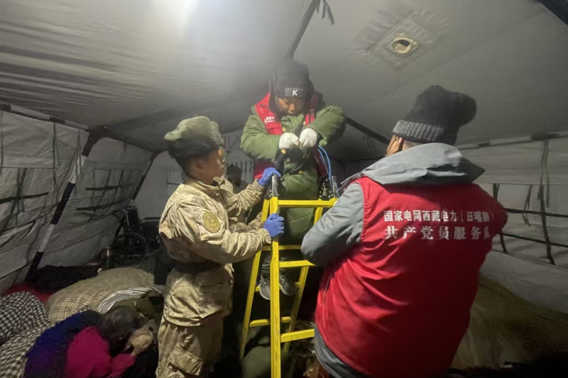 ▲國網西藏電力員工為定日縣安置點帳篷接通照明電力線路