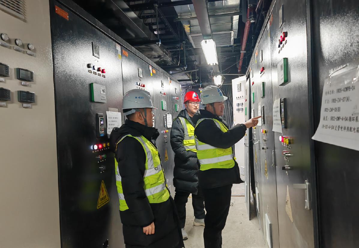 “必須保證所有變電所分閘,防止重新送電時電流直接沖擊設備”“屋面泵房再去兩個人,重新起泵并保證壓力正常”“拿好對講機,一間屋一間屋地送電”……現場總指揮、項目生產經理閆鵬的聲音堅定有力,全體值班人員嚴陣以待,緊張有序地執行著操作指令。送電后,屋面泵房傳來水泵“轟隆隆”的機器運轉聲。調試成功有效驗證了柴發機組自身穩定性和機組系統負荷控制能力,值班人員激動地歡呼。