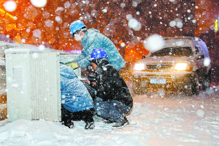 圖④ 1月6日,山東威海供電公司員工在花園南路小區搶修,快速恢復客戶供電。劉中華 攝