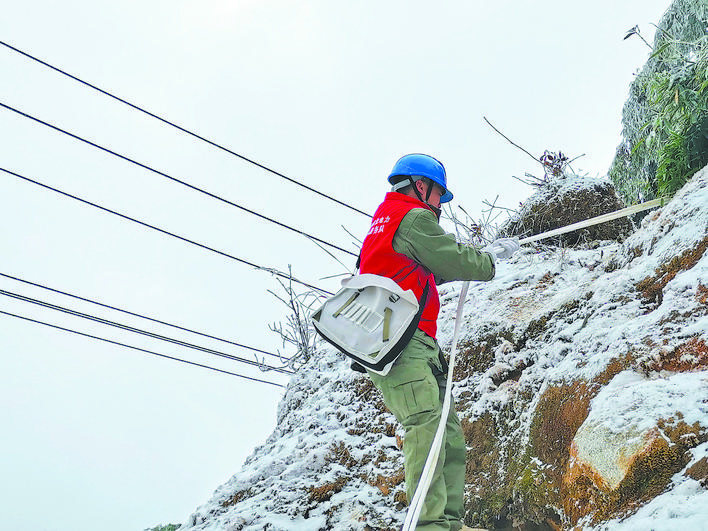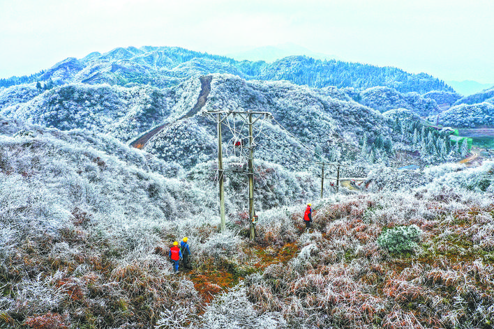 圖① 1月6日,國家電網湖南電力共產黨員服務隊在雪峰山觀冰站巡檢線路。 胡浩 攝