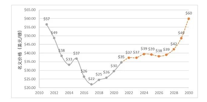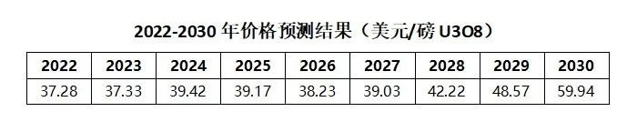 報(bào)告還對(duì)2022-2030年天然鈾現(xiàn)貨價(jià)格作了預(yù)測(cè)。之所以選擇對(duì)長期現(xiàn)貨價(jià)格進(jìn)行預(yù)測(cè),是因?yàn)樵搩r(jià)格是反應(yīng)市場(chǎng)供需關(guān)系的主要指標(biāo),是長貿(mào)協(xié)議引用的重要指數(shù),且不易受到短期市場(chǎng)投機(jī)行為的影響。